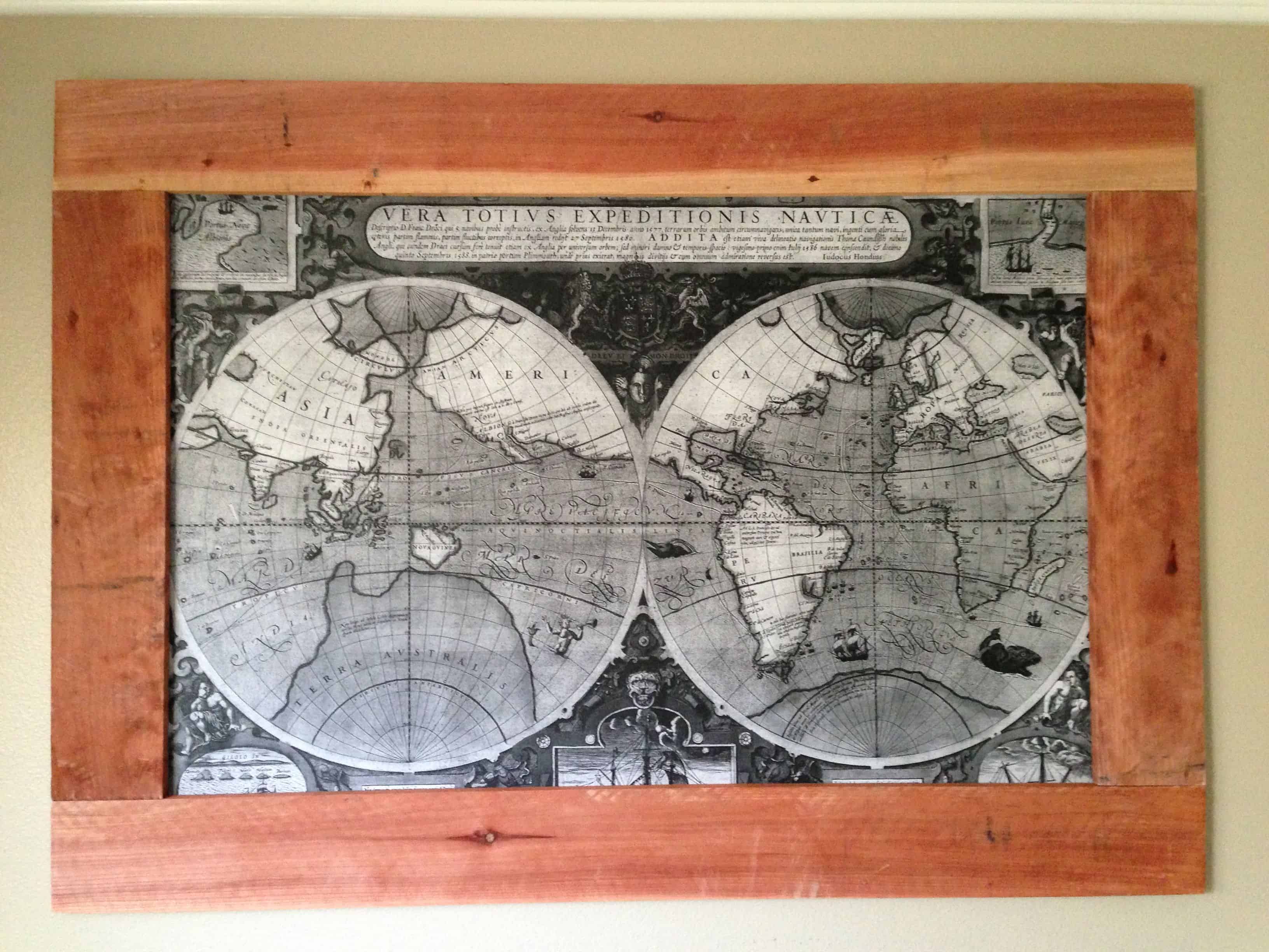 I wasn't sure how to proceed until I was in a Starbucks of all places. They had a bulletin board with a wood frame. Instead of using miter joints for the corners, they used butt joints. It had a cool, raw look to it and it was perfect for the old-timey map feel.