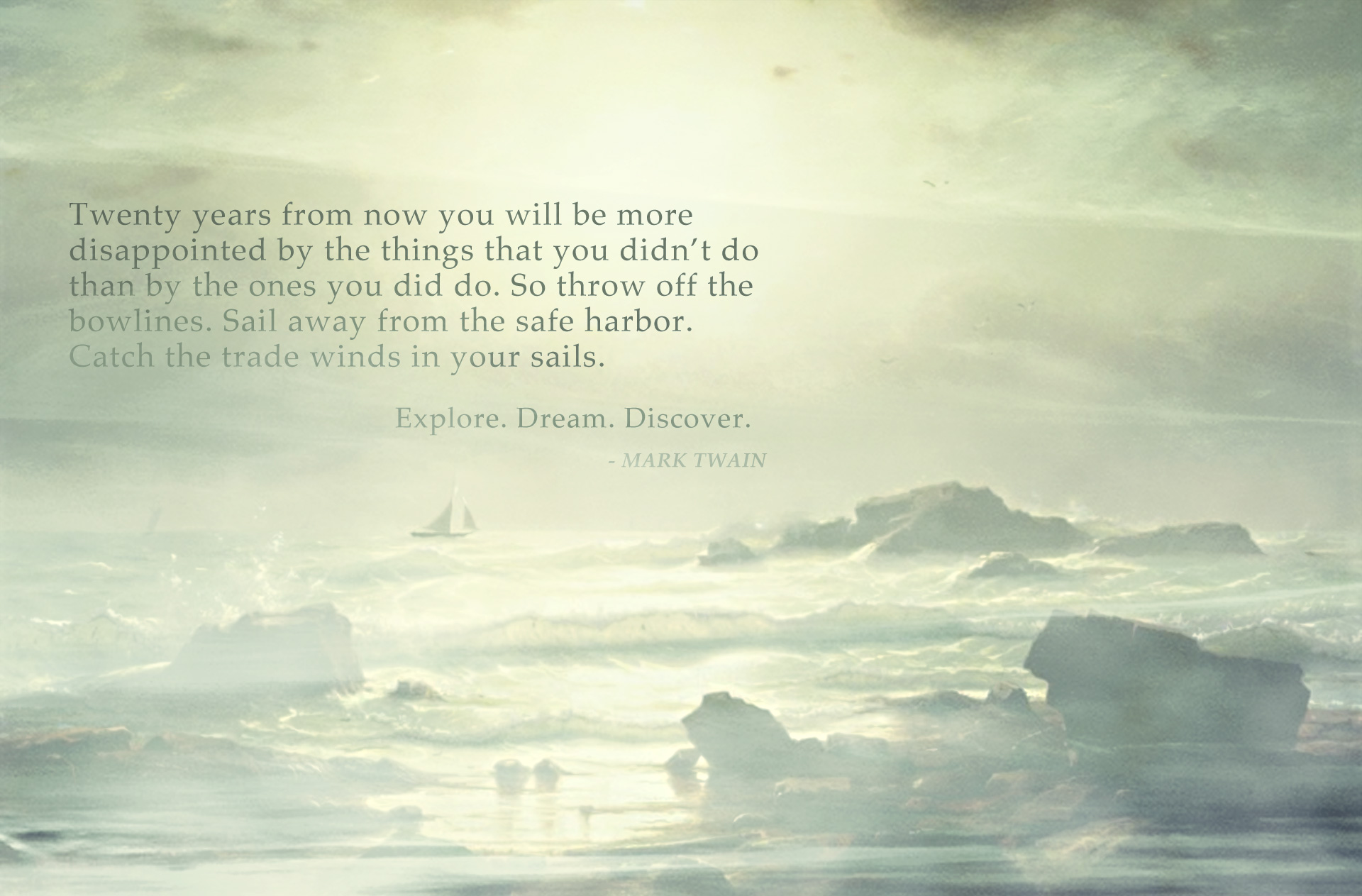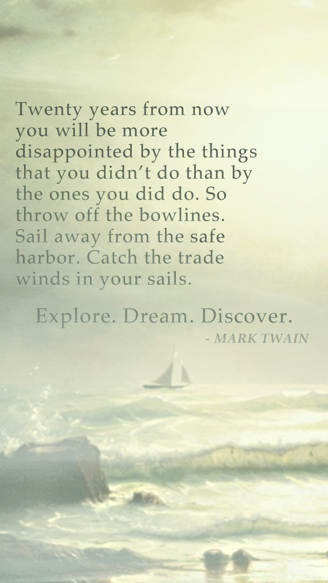 Mark Twain once said: “Twenty years from now you will be more disappointed by the things that you didn’t do than by the ones you did do. So throw off the bowlines. Sail away from the safe harbor. Catch the trade winds in your sails. Explore. Dream. Discover.”