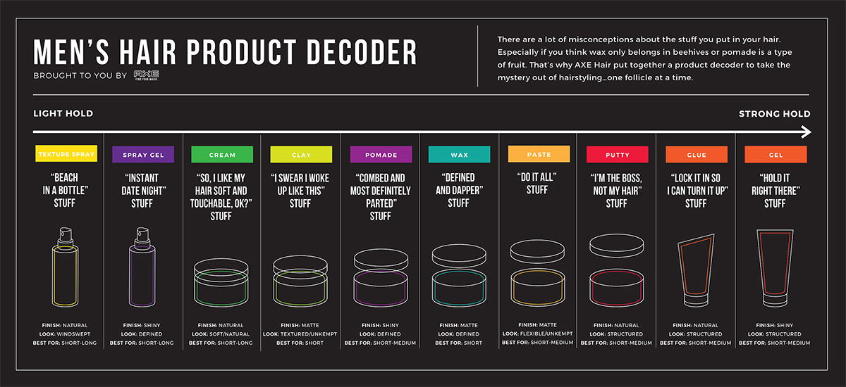 That’s why Axe developed a helpful PSA: The Hair Product Decoder that defines which product types are best for what types of hair and for which styles. On top of that, they’ve developed a deep treasure trove of hair knowledge with videos and how-to’s so you can nail your perfect style.