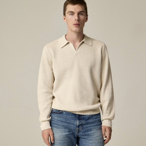 This has a thick, almost overly exaggerated pique polo texture, and with the buttonless Johnny collar and it’s relaxed fit, it feels wonderfully from a different time and completely current. You wear it with a pair of light wash jeans like the model is and you’re good to go.